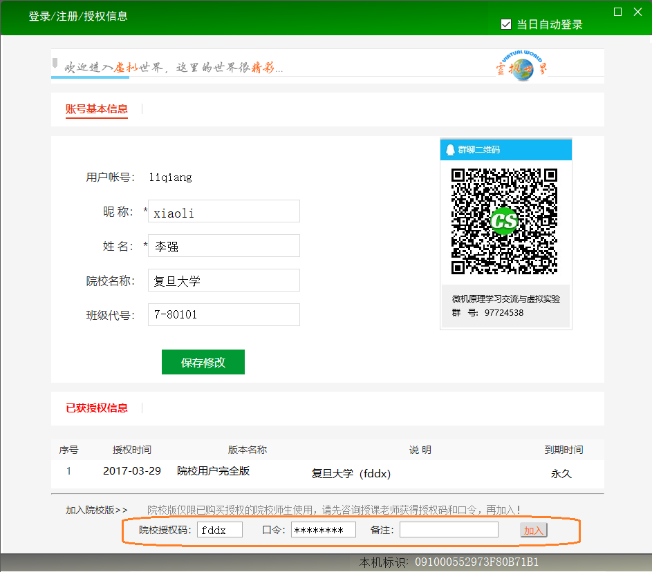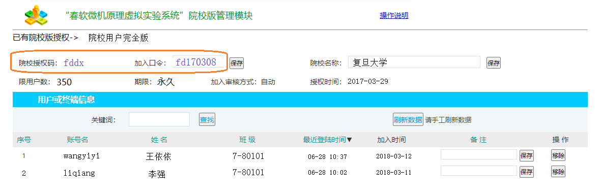 只需将“院校授权码”和“加入口令”一起提供给学生,学生在软件登录窗口下方输入后即可加入,并即时正常使用。 其中“加入口令”在此可以随时修改。 申请加入的数量超过限制数后,则无法再加入。 当实验室需要更换PC电脑,或新学期新班次学生使用时,管理者可以通过移除操作,将之前加入的PC或用户删除,新的PC或用户即可再申请加入。